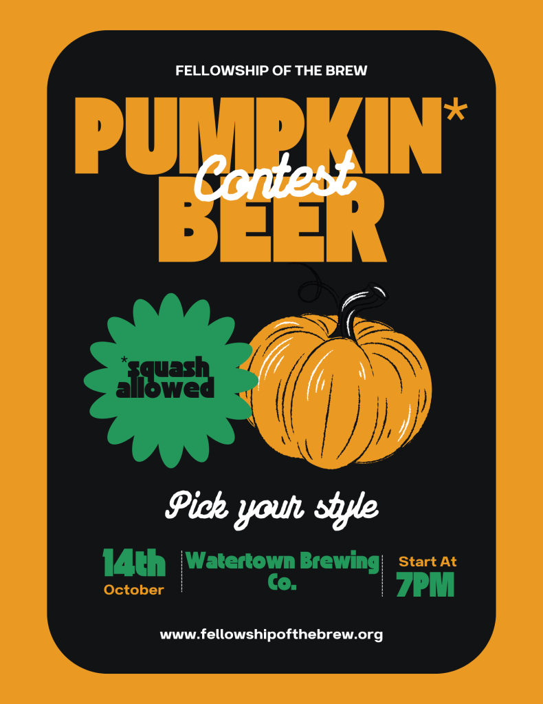 Guidelines: Pumpkin added to any beer style of your choice. Squash is allowed (there’s some thinking that pumpkin doesn’t add “pumpkin” flavor to beer). Mead or other yeast fermented beverages allowed.